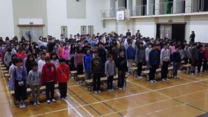 5・6年生が合同で卒業式練習をしています。入場から退場まで流れを確認しながら練習しています。