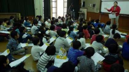 学年集会をしています。「みんなのやくそく」のプリントを使って,学校や地域での約束やマナーなどについて話しています。