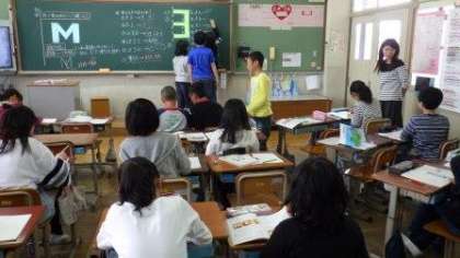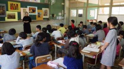 5年生は図工で,スクールサポーターの先生と一緒に学習しています。たくさんの絵を鑑賞し,自分が感じたことや考えたことを発表しています。6年生は算数の学習で,対称な図形について学習しています。