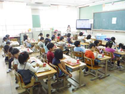 1年生の教室では,おかずの蓋を開けると「いいにおい〜おいしそう〜」と歓声が上がっていました。もりもり食べてげんきいっぱい大きく成長してほしいと思います。