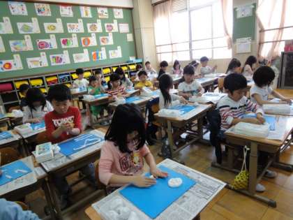 自分の机を囲むくらい長いひもを作ったり,ねんど板いっぱいにひもで絵を描いたり楽しそうに活動していました。