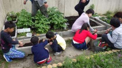 わかたけ学級の子どもたちが「わかたけ農園」で野菜の苗を植えています。トマト・ピーマン・なすの苗を植えた後は,ポップコーンの種もまきました。