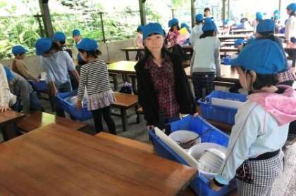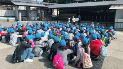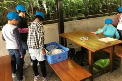 野外炊事が始まります。食事係の子どもたちが説明をしています。