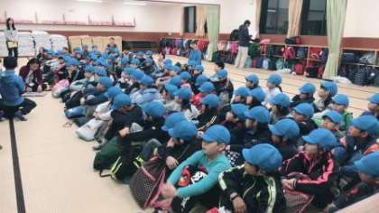 星の観察を終え,90畳の部屋で一日のふり返りをしました。「挑戦」「協力」「責任」「集中」,4つの「スター」を高められたか,また,明日はどの「スター」を高めたいかを考えました。そして,各クラス3人の子どもたちがふり返りを発表することに「挑戦」しました。