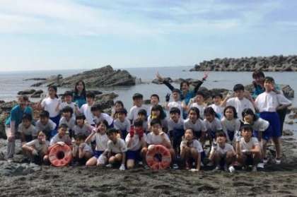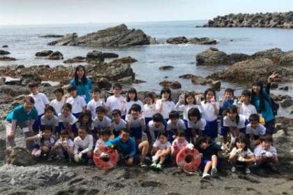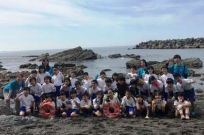 宮崎浜で磯観察をします。クラス写真も撮りました。