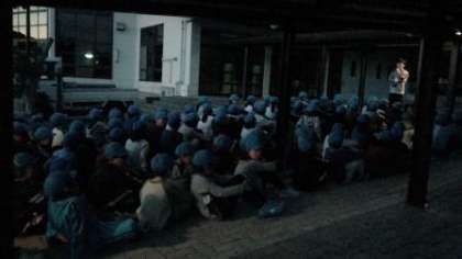 予定通りキャンプファイヤーを行います。プレイホール前で静かに待っています。