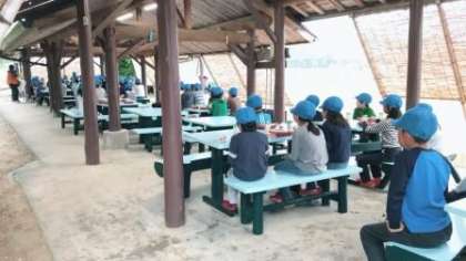 あずまやで朝食を食べました。みんなの前に人が立ったら,すぐに静かにして聞くということができているのがすばらしいです。