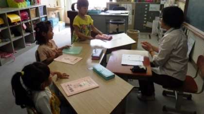 1年生は算数で数の学習をしています。6年生は算数で面積の求め方について話し合いをしています。1年草の芽学級は,学校司書の先生に学校図書館について教えてもらったことを復習しています。