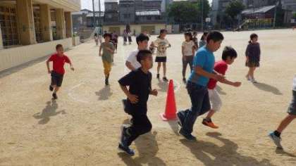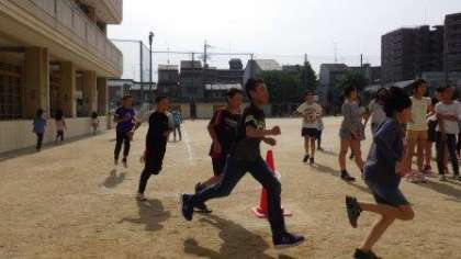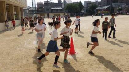 6年生が集団登校後に週2回,運動場でランニングをしています。