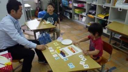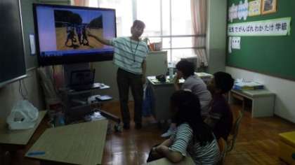 1年生と2年生は生活科の学習で学校たんけんをしています。わかたけ学級4年生と6年生は,先週のみさきの家野外活動について,写真を見ながら振り返りをしています。わかたけ学級2年生は算数の学習で,たし算の問題をつくったり答えたりしています。