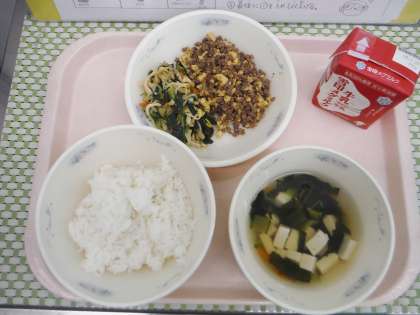ビビンバは韓国・朝鮮で食べられている混ぜごはんです。子どもたちはスプーンを使ってご飯にのせてまぜて食べていました。3年生は校外学習・6年生は修学旅行のため給食なしでした。