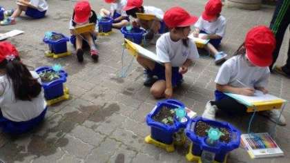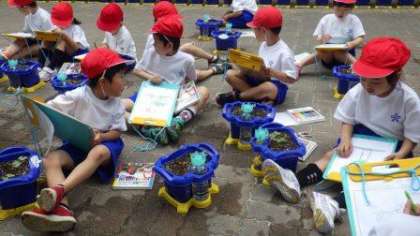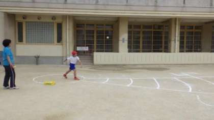 1年生が新体力テストのソフトボール投げをしました。終わったクラスは,アサガオの観察もしました。