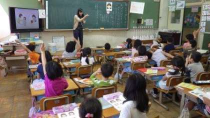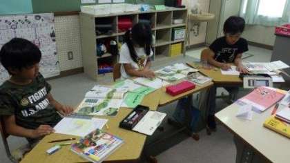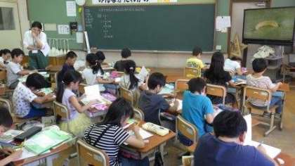 3年生は理科の学習で,幼虫の成長の様子を映像教材を使って確認しながら,ワークシートにかいています。1年生は,道徳で自分の考えを発表しています。