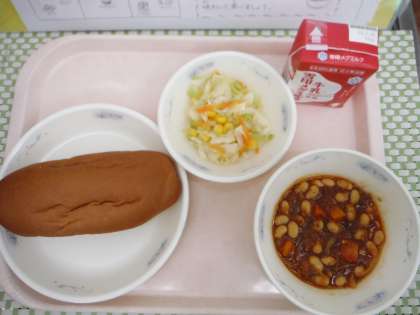 大豆は給食室で30分お湯につけた後,柔らかくなるまでゆでています。その後,肉や野菜と一緒にトマト味で煮込みました。大豆がやわらかくふっくらとしていて美味しいと好評でした。