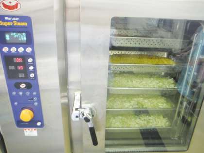 野菜のソテーのコーンと人参とキャベツは,スチームコンベクションオーブンで蒸してから炒めています。