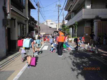みんな元気に登校してきます。スクールガードリーダーさんが月に1度,校門前で子どもたちの安全を見守ってくださっています。