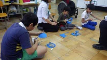 6月らしいかざりをつくっています。アジサイや雨,てるてるぼうずなどを作りました。