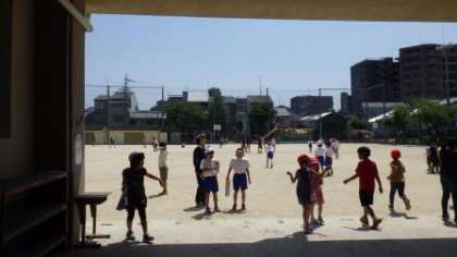 気温が上がっています。ピロティ(運動場側)のミストシャワーを使用して,熱中症対策をしています。