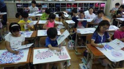 アジサイを,絵の具を使って描いています。混色を工夫しながら色をぬっています。