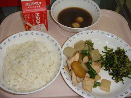今日の献立は,「麦ごはん・牛乳・平天とこんにゃくの煮つけ・大根葉のごまいため・ぜんざい」でした。