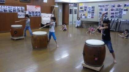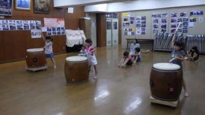 和太鼓の練習をしています。今日は,1・3・4年生が一緒に練習しました。