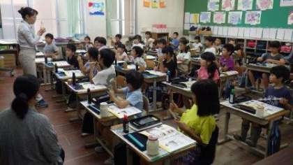 初めて毛筆の学習をしました。今日は,校長先生に教えていただきました。