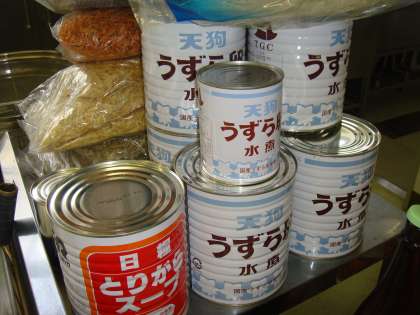 ※今日の献立は,台風がきた時にそなえて,学校に保管しておいた缶詰(うずらたまご)や,乾物(中華麺・わかめ・はるさめ・しいたけ・乾燥たまねぎ)を使ってつくりました。ソースやきそばには,豚肉・いか・キャベツ・にんじんも加えました。