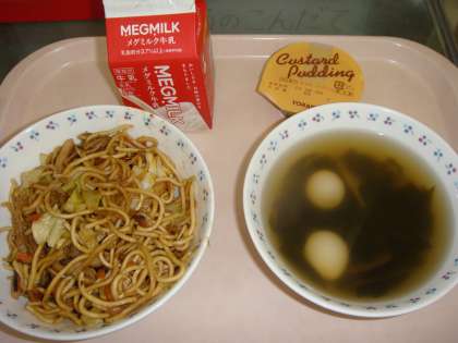 今日の献立は,「ソースやきそば・牛乳・わかめスープ・プリン」でした。
