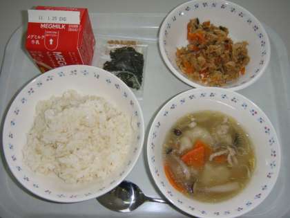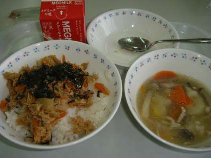 今日の献立は,「麦ごはん・牛乳・そぼろ丼の具(きざみのり)・すいとん」でした。この献立は,「防災とボランティアの日」の献立です。