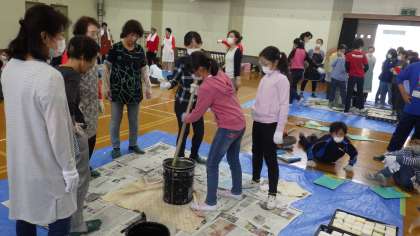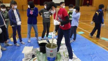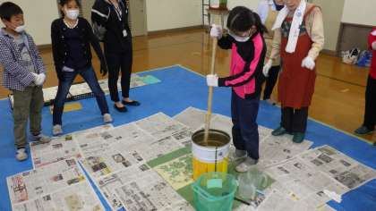 地域の女性会の皆様,上京エコまちステーションの皆様を講師にお招きし,廃油を使った石けん作りをしました。みんなで交代しながら材料をしっかりと混ぜています。