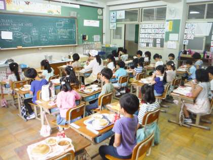 「トマトシチューとバターうずまきパンを合わせらおいしかったから,また食べたいです。もやしのカレーソテーは,カレーの味がしみていておいしかったです。」(2年児童)