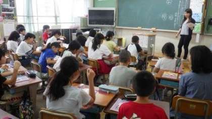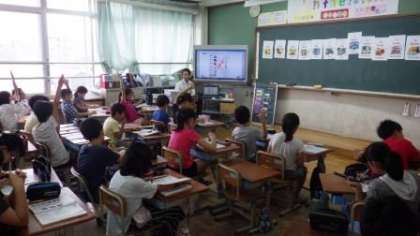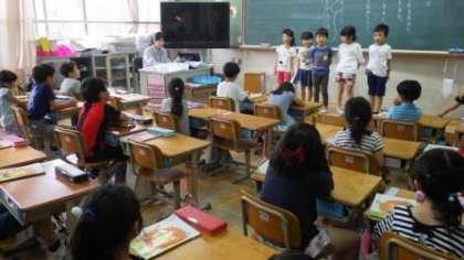 5年生は外国語活動で,英語で月の表し方について話しています。6年生は道徳の活動をしています。1年生は,楽しかったことをみんなの前で発表しています。