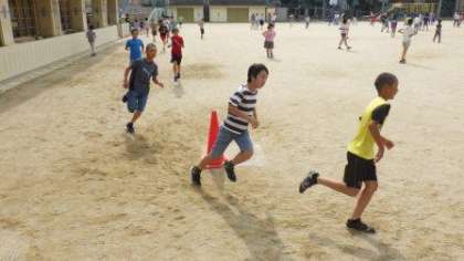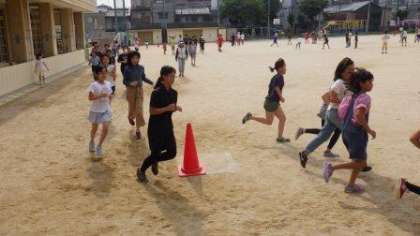 集団登校後に6年生が朝マラソンをしています。