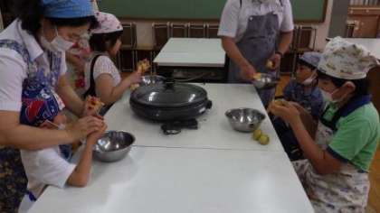 「わかたけ農園」で育てたジャガイモの収穫を祝う「わかたけパーティー」をしています。はじめに「おいものうた」を楽しく歌いました。次に,収穫したジャガイモを使って,じゃがいももちとフライドポテトの調理実習をしています。みんなで協力して皮をピーラーでむいたり,ホットプレートで焼いたりして,楽しく調理しています。