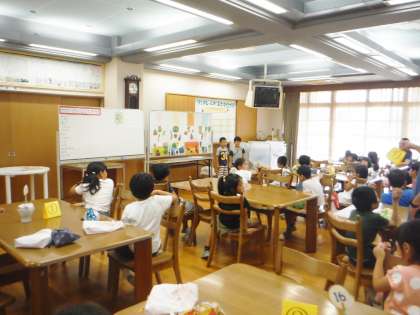今週は,2年生がランチルーム週です。今日は,2年1組が給食前に食の学習を行いました。テーマは「やさいとなかよくなろう」です。夏野菜のピーマンやなす・トマトなどが特に苦手な児童が多くいました。旬の時期の野菜は,安くておいしくて栄養価が高いことを学びました。