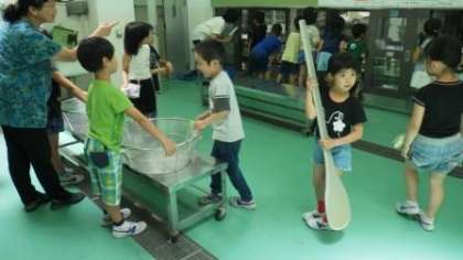 給食をつくっている様子や道具の見学をしました。サービスホールで,大きなざるやしゃもじをさわってみたり,給食調理員さんが大きな釜で調理している様子を見学したりしています。