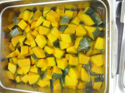 今日のかぼちゃの煮つけは,スチームコンベクションオーブンを使って作りました。かぼちゃのやさしい甘みがありました。煮崩れなくきれいに仕上がりました。