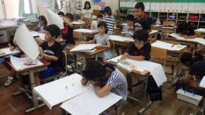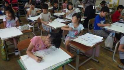 家や教室,恐竜など,想像を広げながら絵を描いています。