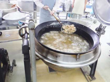 給食では,しょうがやしょうゆなどで下味をつけたはもに,米粉と片栗粉をつけて油で揚げてこはく揚げにしました。