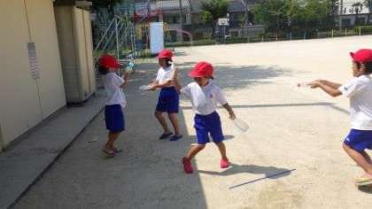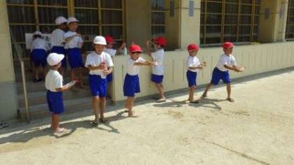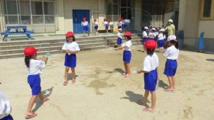 家で用意していただいた空き容器を使って,水で地面に絵を描いたり,友達と水をかけ合ったりして,楽しく過ごしました。