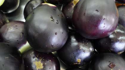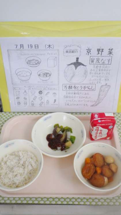 京都府産の「賀茂なす」「万願寺とうがらし」を使用した地産地消の献立です。賀茂なす,万願寺とうがらしとこんにゃくを炒めたものに,教室で田楽みそのように,みそだれをかけて食べます。給食のみそだれは,「八丁みそ」と「信州みそ」を使っています。八丁みそは,ごまとの相性が良く独特のこくとうまみがあります。