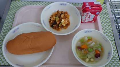 「やさいのスープ煮に,豆やキャベツやは汁とまざっておいしかったです。これからもよろしくお願いいたします。」(4年児童)
