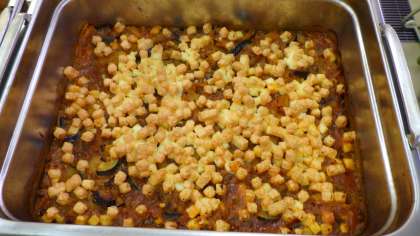 夏野菜のボロネーゼは,スチームコンベクションオーブンを使用した新献立です。夏においしいズッキーニとなすの入った牛ひき肉のソースに焼いたじゃがいもを入れます。さらにチーズをのせて,スチームコンベクションオーブンで焼きました。ボロネーゼとは,イタリアのボローニャ地方の家庭料理で,「肉の入ったソースを使った料理」のことです。