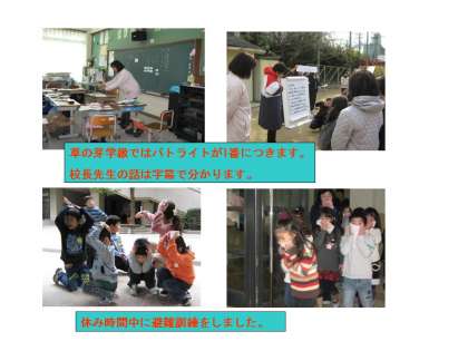 今回は,中間休みの時間に地震が発生し,その後で火災も発生したという設定で行いました。いつもと違う避難訓練でしたが,子どもたちはすみやかに避難しました。校長先生のお話の中にも,「阪神・淡路大震災について6千人ほどの方がなくなり,たくさんの家屋が焼失したことを教訓に,普段から備えておきましょう。」ということがありました。