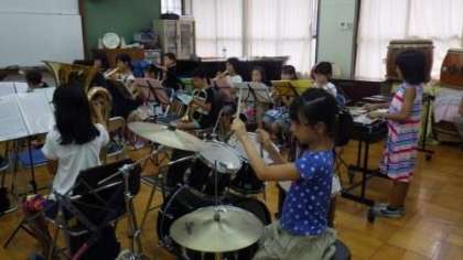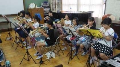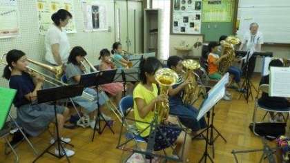金管マーチングバンド部が夏休みの部活動をしています。9月の運動会や演奏会での発表に向けて,練習をがんばっています。