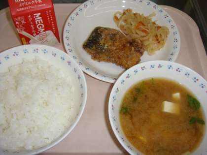 今日の献立は,「ごはん・牛乳・さばのたつたあげ・紅白なます・みそ汁」でした。