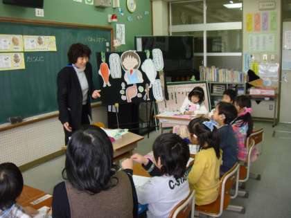 パネルシアターを使い「にんじん・ごぼう・だいこん」の話をしたり,体の中での働きについて知らせたりしました。その後,にんじん・ごぼう・だいこんさんにお手紙を書き,最後に全員,そのお手紙を発表しました。