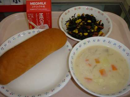 今日の献立は,「あじつけコッペパン・牛乳・じゃがいものクリームシチュー・ひじきのソティ」でした。