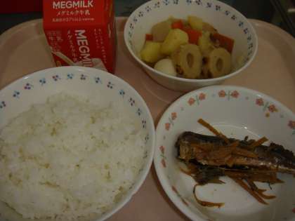 今日の献立は,「ごはん・牛乳・いわしのしょうが煮・関東煮・いり豆」でした。