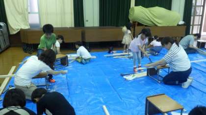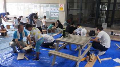 受付・準備をしてくださっている頃から雨が降りだしましたが,本棚やいすなどを楽しく作っています。完成が楽しみです。